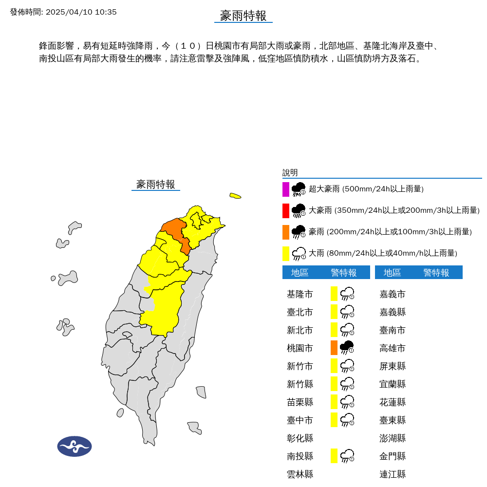 中央氣象署指出,因鋒面影響,易有短延時強降雨,今日桃園市有局部大雨或豪雨,北部地區、基隆北海岸及臺中、南投山區有局部大雨發生的機率,請注意雷擊及強陣風,低窪地區慎防積水,山區慎防坍方及落石。