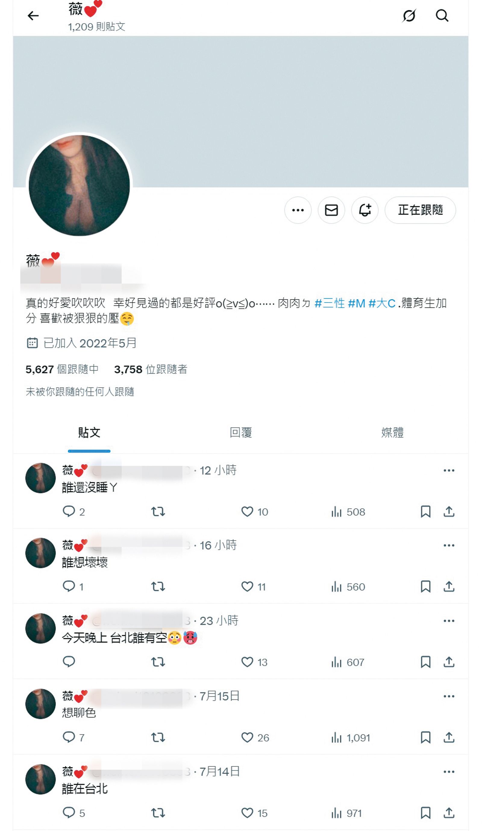 薇薇至今在個人社群上仍經常發表「約跑」文章,自介也是非常煽情。(圖/翻攝自X.com)