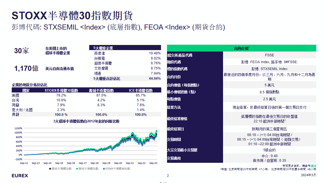 該指數是以美元計價的價格回報指數,於最近剛剛推出。STOXX®半導體30指數期貨將全天候交易,從中歐時段1:00(香港/新加坡時間上午8:00)到中歐時段22:15,同時覆蓋美國至亞洲的完整交易日。