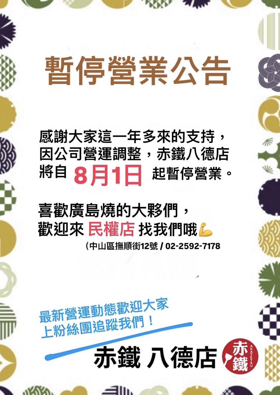 赤鐵廣島燒專賣店 - 八德店已於8/1停業。(圖/翻攝自臉書@赤鐵廣島燒專賣店 - 八德店)