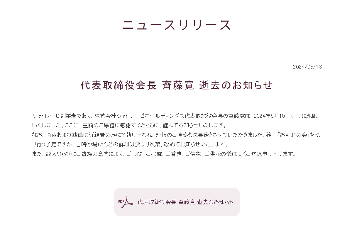 莎得徠茲在13日發出公告,表示品牌創辦人兼董事長齊藤寬於8月10日逝世,守靈和葬禮只開放給親近的人參加,日後會擇期舉行告別式,待日期、時間、地點等細節確認後,會再公布消息,家屬也拒絕任何弔電、弔唁、祭品、鮮花等。