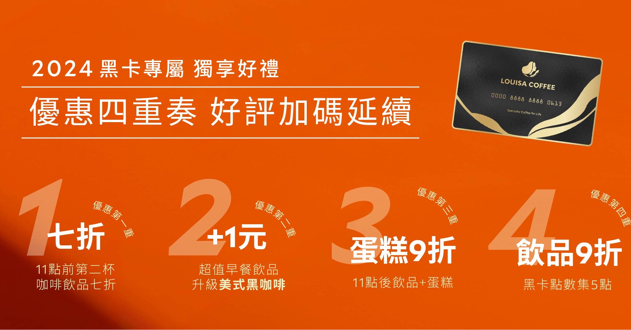 「莎粉」快看!路易莎黑卡會員優惠好評加碼延續將於9月12日截止,四大優惠包含:11點前第二杯咖啡飲品7折、超值早餐加一元飲品升級美式黑咖啡、11點後喝咖啡吃蛋糕,蛋糕享9折、憑5點換任1飲品享9折(以定價計算)等。