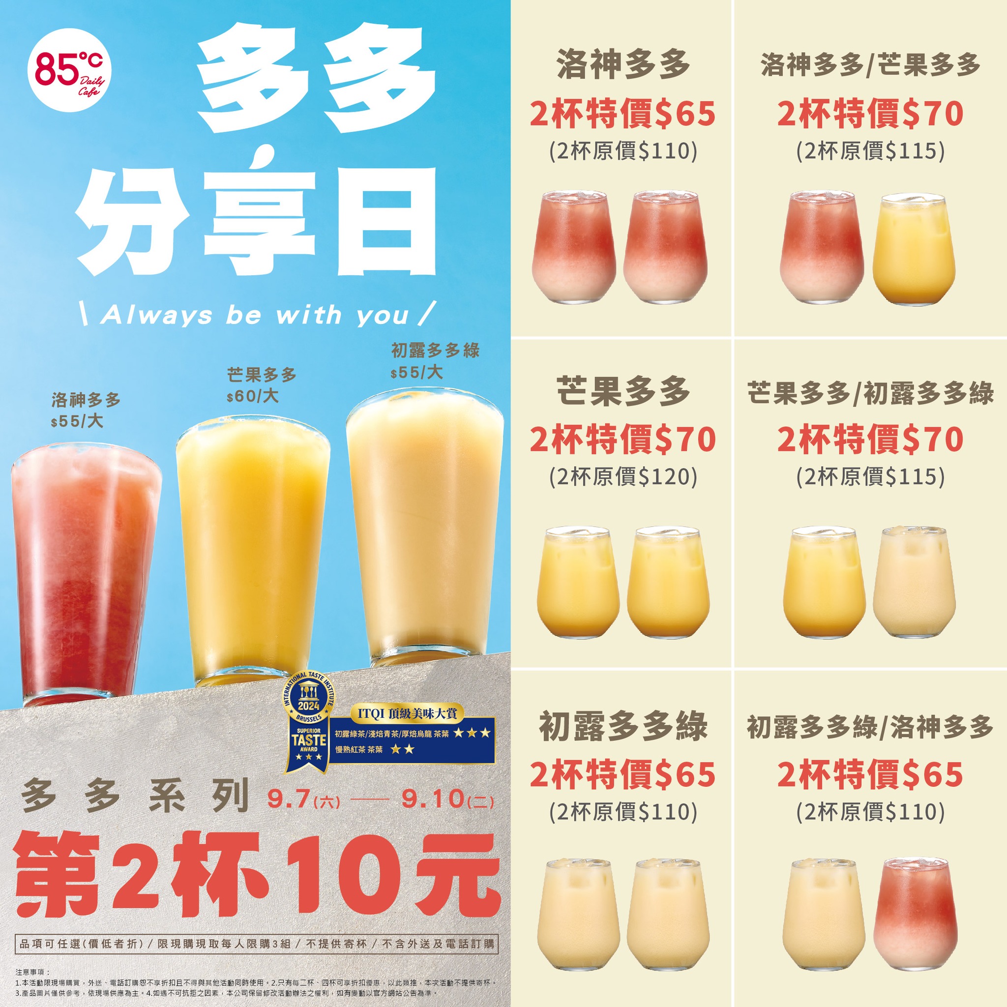 而優惠活動品項可任選,價低者折,限定現購、現取每人限購3組,不提供寄杯,不含外送及電話訂購,多多控快把握時間喝起來。