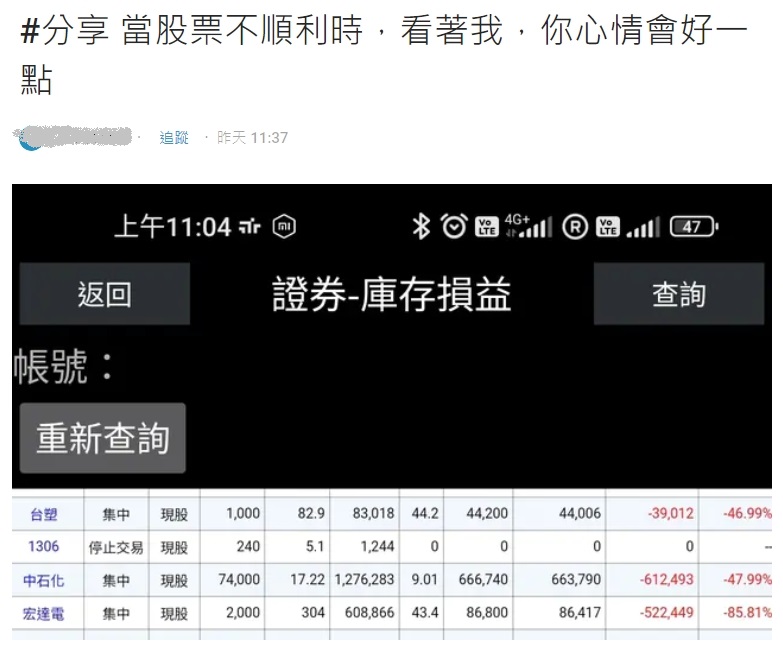貼文一出,引來一名網友表示,「我是在明知石化業前景不佳的情況下一路補,每天祈禱總管理處能想出解決辦法。」原Po則回覆,「每一檔股票背後都有一個故事,買的原因只有一個,以為會上漲,下跌是我意料之外,所以不攤平,股票跌了,代表我買進的時侯看錯了。」