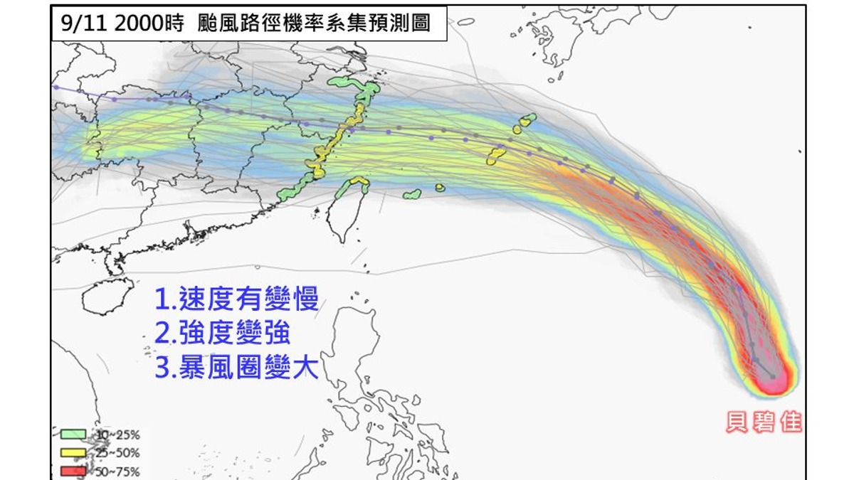 其次,「颱風強度有增強趨勢」,昨日的預測顯示,貝碧佳的最強強度處於中颱的下限,而最新的觀測結果顯示,颱風有明顯增強的趨勢,預計在14日至15日之間達到中颱的強度,這一變化意味著颱風可能帶來更強的風雨影響。