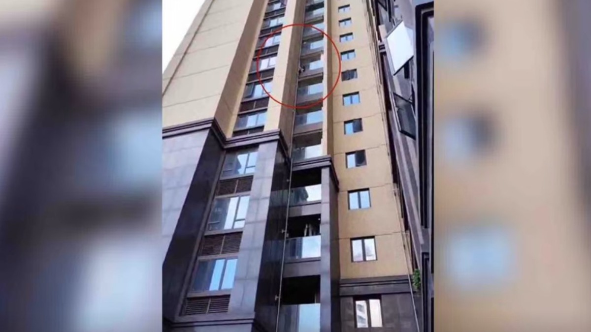 一名8歲女童不知為何翻出護欄,雙手抓著瓦斯管懸掛在8樓外牆。(圖/翻攝自抖音 @正經人(好物推)