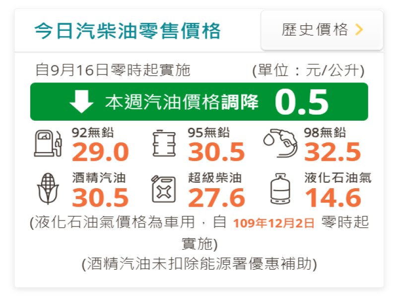 台灣中油表示,自明(16)日凌晨零時起汽、柴油價格各調降0.5元及0.6元,參考零售價格分別為92無鉛汽油每公升29.0元、95無鉛汽油每公升30.5元、98無鉛汽油每公升32.5元、超級柴油每公升27.6元。本週因平穩措施啟動,汽、柴油各吸收0.2元。