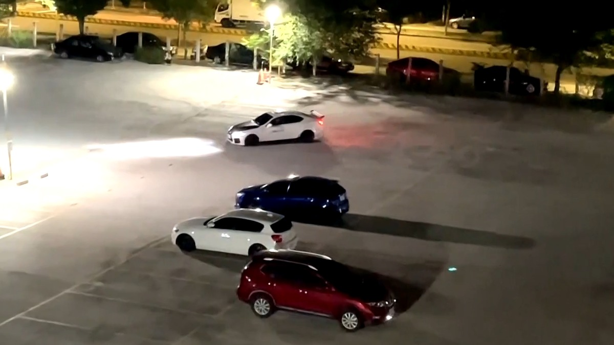空曠的停車場內,一台白色轎車猛踩油門再急煞,發出刺耳尖銳的聲音,想甩尾甩不出來,在裡面瘋狂繞圈,一旁還有人在教學,這台白色轎車就這樣繞了大概3-4圈離去,附近住戶被這聲音吵到受不了。