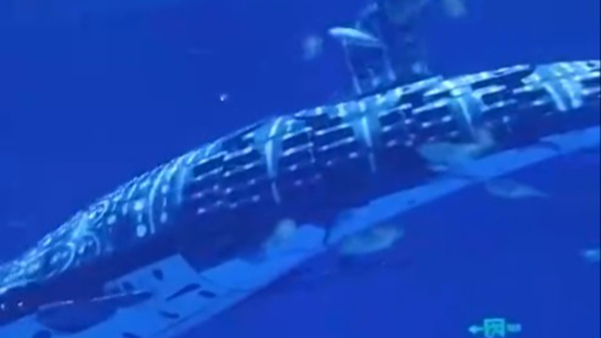 中國大陸一間水族館展示「機械鯨鯊」。(圖/翻攝自小央視頻微博)