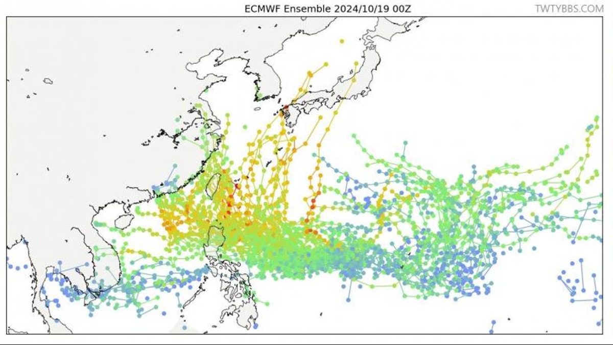 台灣颱風論壇昨(19)日公布歐洲模式最新預估路徑,從圖片中可見,台灣上空密密麻麻,出現了10幾條路徑。同時粉專也提醒大家,確實需要注意天氣,但也強調目前不用太緊張,因為時間還早,至少要下周後期才會確定路徑,預報還有變動空間。目前知道颱風活躍機率高,若民眾想知道颱風的最新資訊,多多關注氣象預報就好。