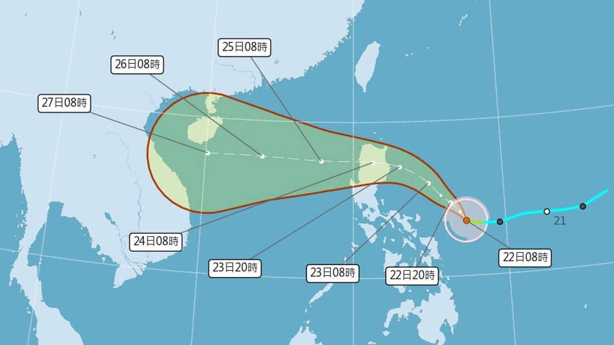 氣象署表示,颱風潭美預估24、25日距台灣最近,雨勢最明顯。(圖/翻攝自中央氣象署)