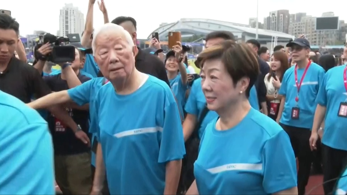 台積電創辦人張忠謀(左)偕夫人張淑芬(右)繞體育場一圈。(圖/東森新聞)