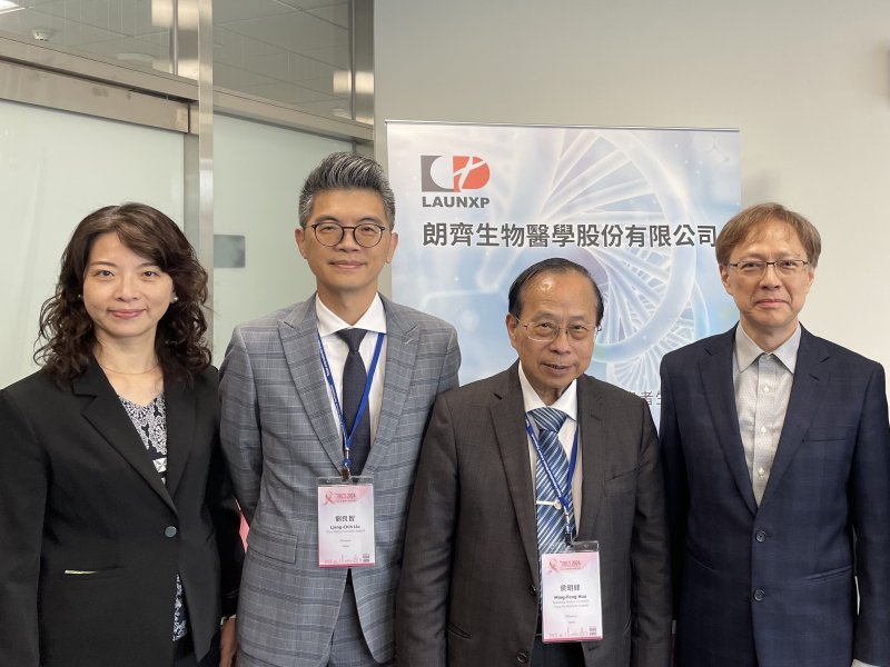 朗齊舉辦TNBC乳癌臨床試驗發表會,乳房醫學權威高醫大院長侯明鋒教授(圖右二)前往站台,左二為中醫大乳房外科劉良智主任,左一為朗齊生醫臨床試驗主管林錦華,右一為竹科育成中心主