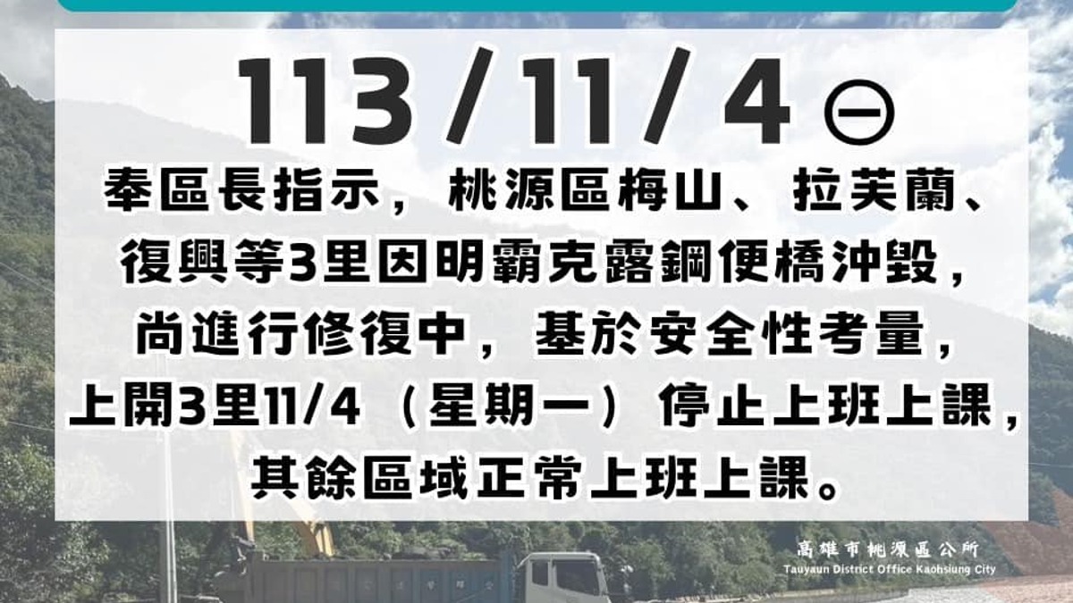 高雄市桃源區公所在臉書公告,奉區長指示,桃源區梅山、拉芙蘭、復興等3里因明霸克露鋼便橋沖毀,尚進行修復中,基於安全性考量,上開3里11/4(星期一)停止上班上課,其餘區域正常上班上課。