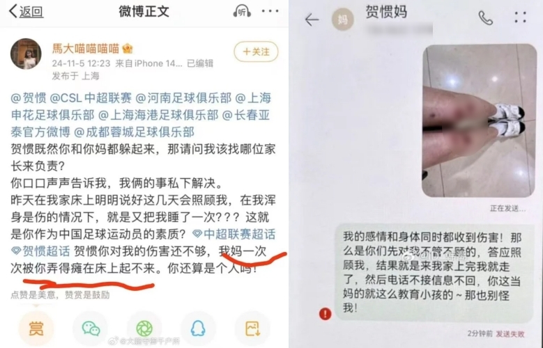 馬大喵喵喵喵在微博曬出雙腳膝蓋受傷的照片,指控賀慣:「昨天在我家床上明明說好這幾天會照顧我,在我渾身是傷的情況下,就是又把我睡了一次?這就是你作為中國足球運動員的素質?」她接著加碼爆料「你對我的傷害還不夠,我媽一次被你弄得癱在床上起不來。你還算是個人嗎」?