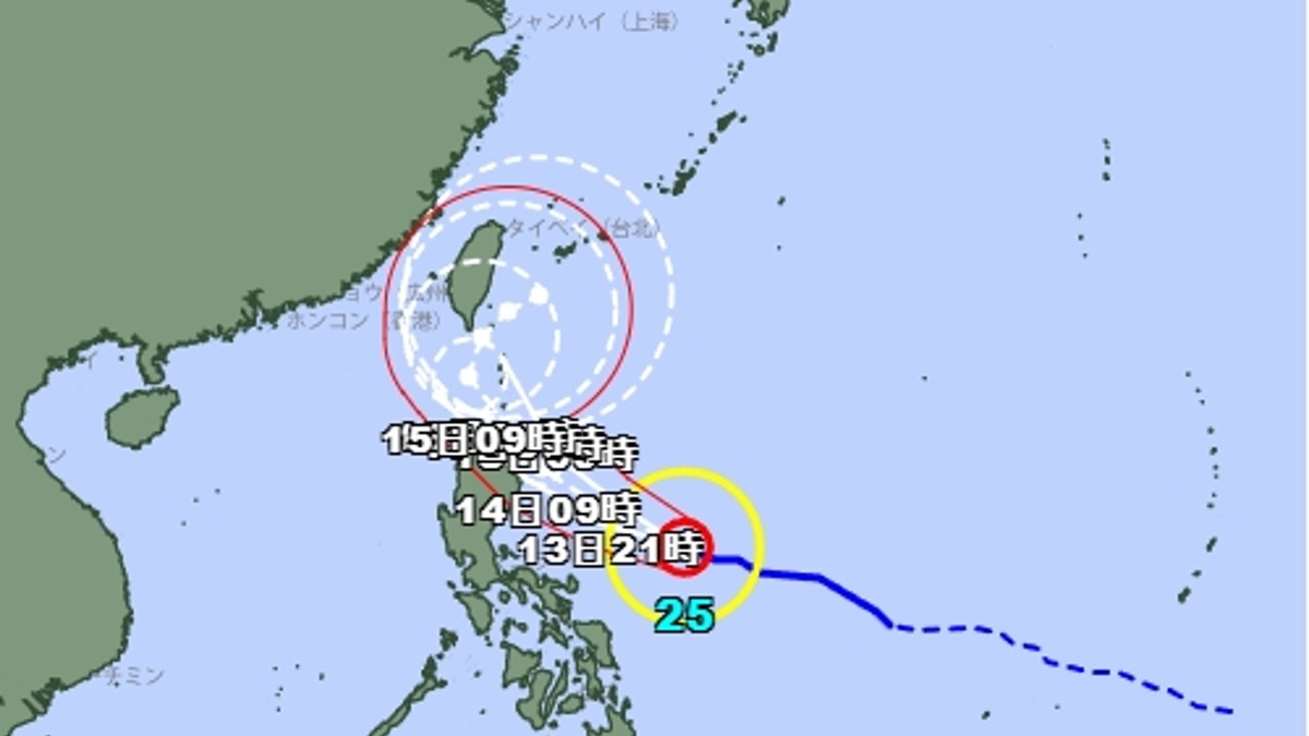 另外,日本氣象協會網站今日上午9時資訊指出,天兔颱風目前位於菲律賓東部,目前正往西北偏西移動,後續將轉為向西北移動,並於14日晚上9點轉北,並於16日晚上9點到達沖繩南部,預計之後將向沖繩南部偏北移動,直至18日9為止。颱風週邊及路徑行經地區將面臨強風、暴雨,海域船舶也需高度警戒。