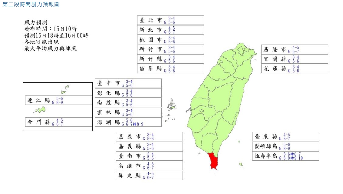 另依據氣象署15日上午10時公布的未來24小時雨量預測、風力預測,屏東縣山區預估雨量達到150至250毫米、台東縣山區及恆春半島均達到200至340毫米。恆春半島今天18時至16日00時、16日00時至06時的風力預測,達到陣風8到9轉9到10、陣風9到10的風力。屏東及台東部份地區均符合停班課標準。