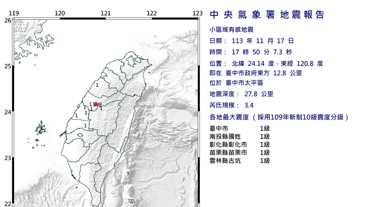 中央氣象署地震報告指出,今(17)日17點50分在北緯24.14度,東經120.8度發生規模3.4地震,深度27.8公里,震央位於臺中市政府東方12.8公里,位於臺中市太平區,最大震度1級。