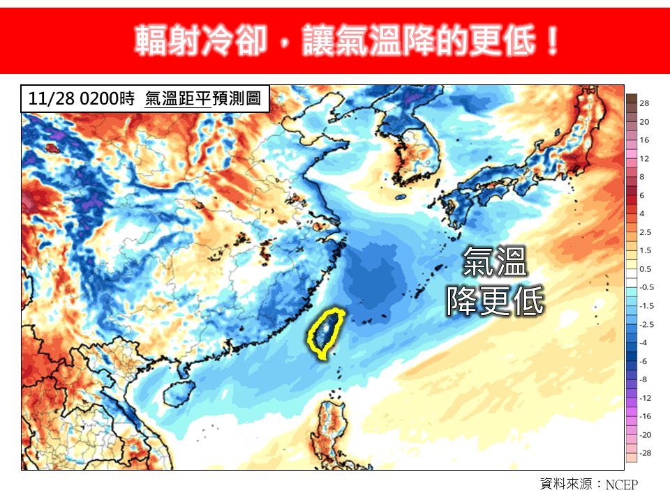 氣象專家林得恩也在臉書上指出,28日、29日間的夜晚到清晨,輻射冷卻效應將會最為顯著,北部、東北部地區最低溫攝氏12至14度,花東地區最低溫攝氏14至16度,中南部地區最低溫也降到攝氏13至16度;近山區空曠平地因輻射冷卻效應影響,可能有攝氏10度左右的低溫。