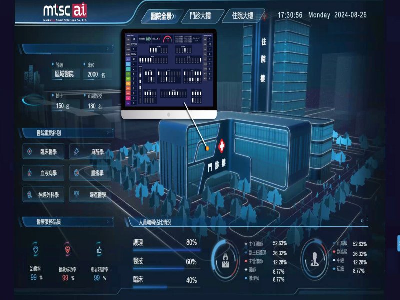 達宣智慧為醫院量身打造的虛擬3D模擬實境系統,結合醫療管理系統,使院方及醫護人員能準確預測、監控及即時查閱Dashboard等數據資訊,並進行模擬決策,從而優化醫院資源調配及管理效率,作為智慧醫院的核心決策工具,可大幅提升醫院營運效率。