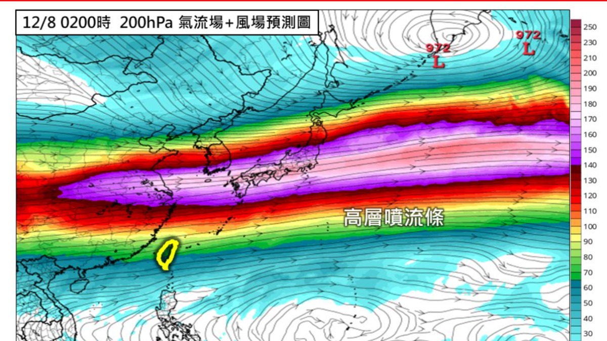 林得恩提到,在高層200hPa(約12000至15000公尺高度),高層噴流條不但位置南壓,且臺灣又適位於其入區的右側,非常適合地面上升運動的發展;又濕、又冷的天氣,至少可以維持個3至4天。