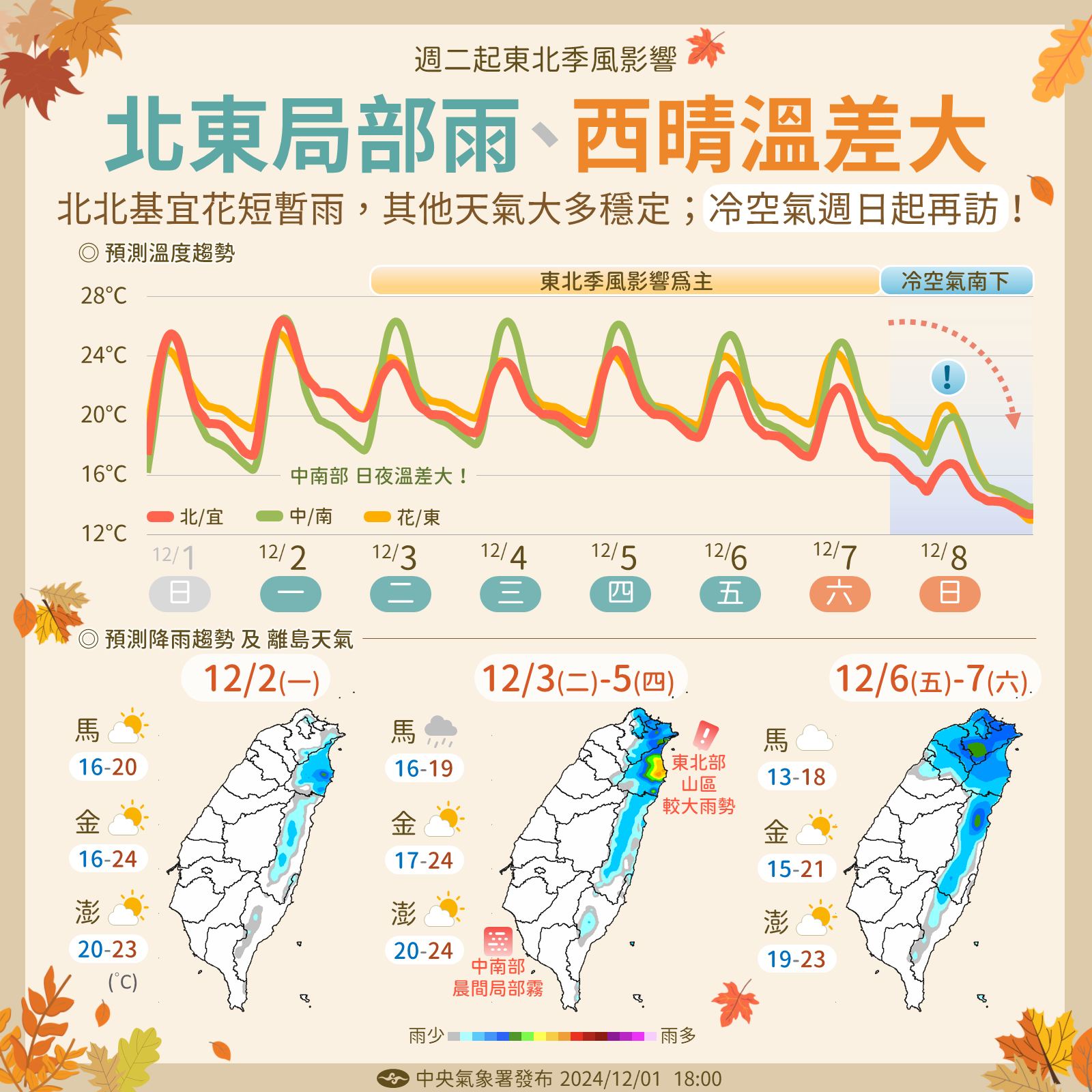 中央氣象署也指出,明(3)日東北季風稍增強,4日至6日東北季風影響,北部及東北部天氣稍轉涼;大臺北、東北部及東部地區有局部短暫雨,東北部山區並有局部大雨發生的機率,北部山區及東南部地區亦有零星短暫雨,其他地區為多雲到晴。