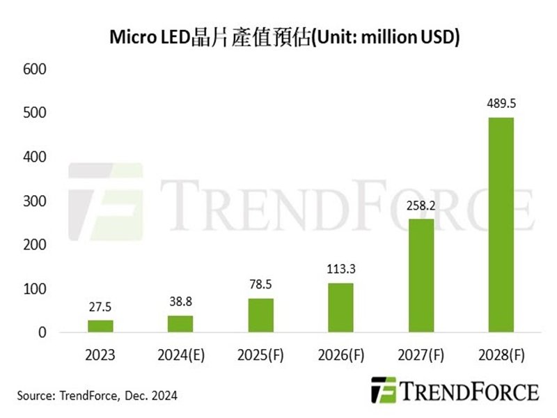 根據TrendForce最新研究,2024年Micro LED晶片產值預估將達3,880萬美元左右,主要貢獻來源仍是大型顯示器。展望未來,技術瓶頸的突破指日可待,而應用面在車用顯示需求具體化,以及AR眼鏡全彩化方案日漸成熟,預計將帶動Micro LED晶片產值於2028年成長至4.89億美元。