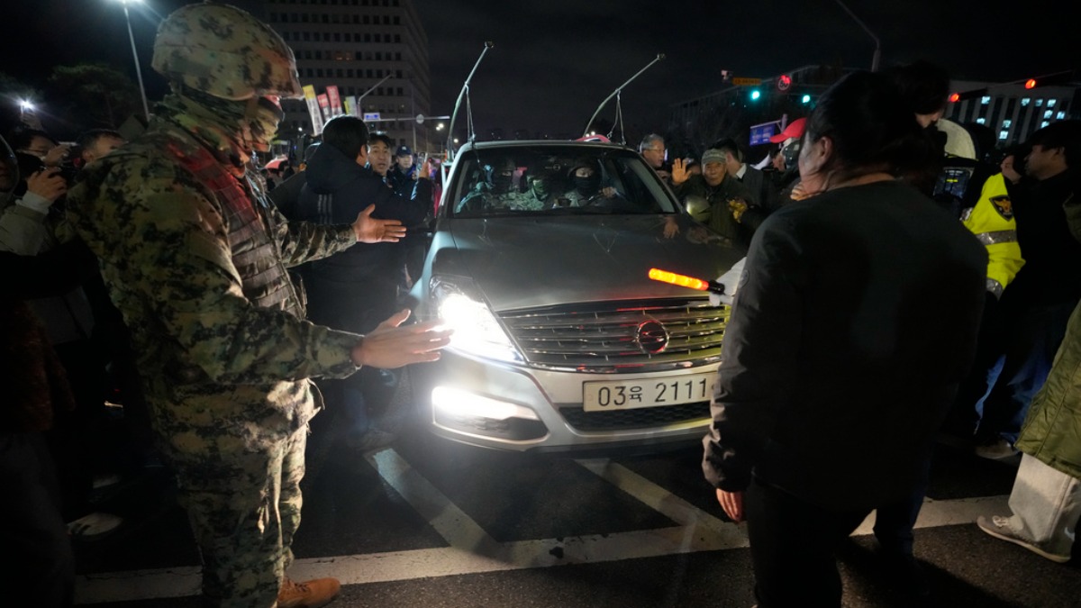 昨天晚間南韓進入戒嚴狀態,軍方出動進駐國會,同一時間有大批民眾出現在國會大樓前,阻止軍隊進入議場內。(圖/美聯社)