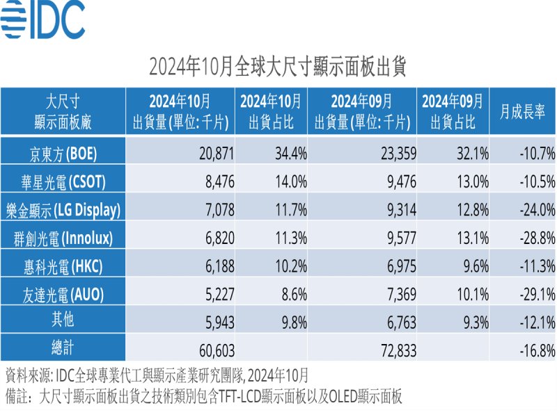 根據IDC(國際數據資訊)「全球大尺寸顯示面板出貨追蹤報告(Worldwide Large Panel Monthly Shipment Volume Tracker)」最新研究結果顯示,2024年10月大尺寸顯示面板月出貨量衰退-16.8%,除電視顯示面板(TV Panel)月減-7.7%外,其餘三種大尺寸顯示面板月成長率均衰退高達兩位數,其中顯示器顯示面板(Monitor Panel)出貨月減-17.7%、筆記本電腦顯示面板(Notebook Panel)出貨月減-28.0%以及平板電腦顯示面板(Tablet Panel)出貨月減-13.9%。