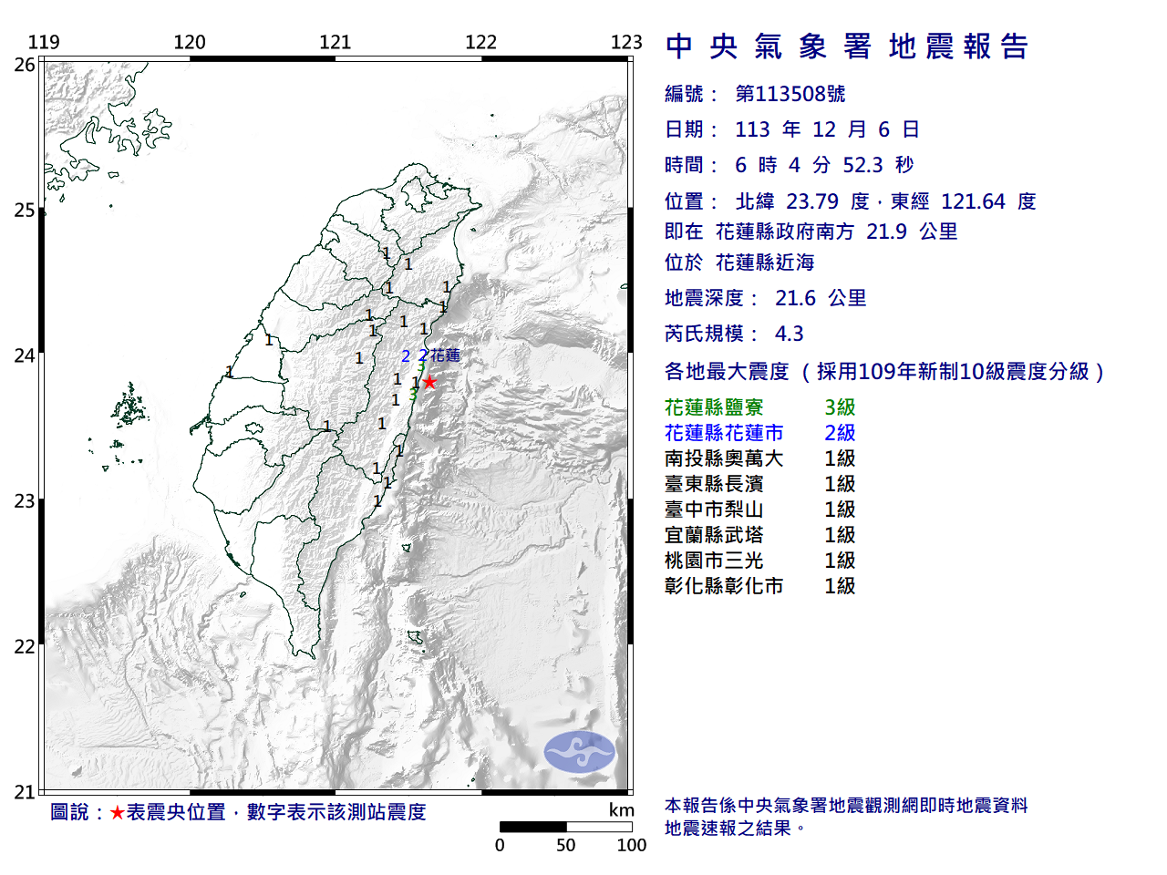 發震時間: 113年12月6日6時04分52秒