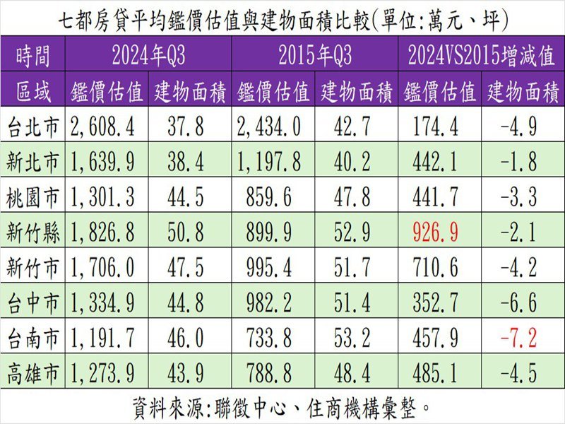 七都房貸平均鑑價估值與建物面積比較。(住商提供)