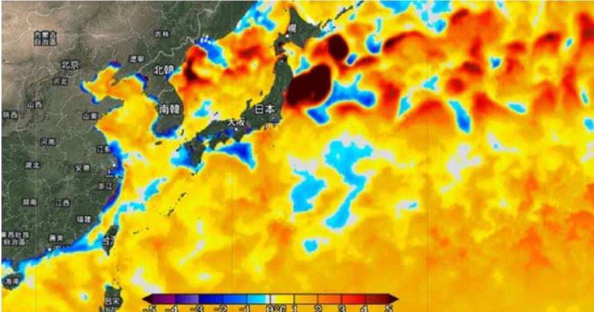 鄭明典指,海溫距平圖是為了和氣候值比較,正的距平暖色系表示現況比氣候值暖,負的距平藍色系則表示現況比氣候值冷,在冬季的冷風吹拂下,海溫的確降了很多,但是和氣候值比較,海溫還是以偏暖的多,這不僅是我們這一區海溫的現象,全球來看海溫和氣候平均比較仍是偏暖。