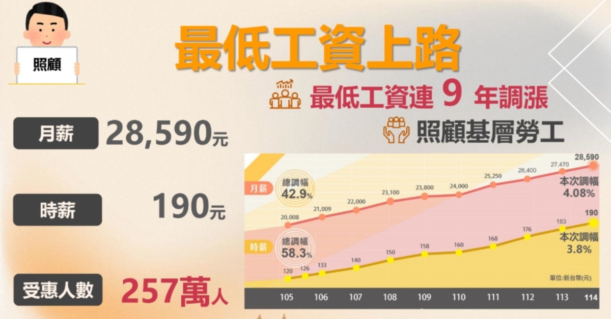 2025年元月起實施之 重大政策及惠民措施,包括最低工資連9年調漲。(圖/行政院提供)