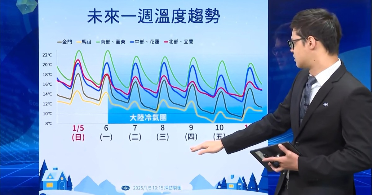 今(5)日是24節氣中的小寒,也就是進入一年中最寒冷的日子,確實要留意,下周開始會一連冷6天,星期一開始,一波大陸冷氣團南下,各地氣溫下降,影響時間持續一週,前期乾冷;星期四起迎風面轉濕冷,苗栗以北下探10度,氣象專家更表示,北部3000公尺以上的高山降雪機會大增加。