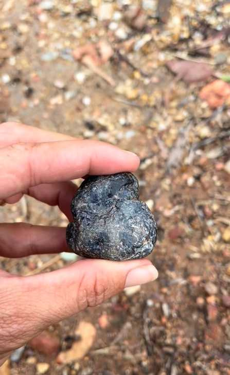 澳洲一名幸運男雨後在礦區散步,發現地上亮亮的蹲下開挖,挖出一顆大石頭竟是394克拉大的藍寶石。(圖/翻攝自TikTok @betteridge_sapphires/CTWANT)