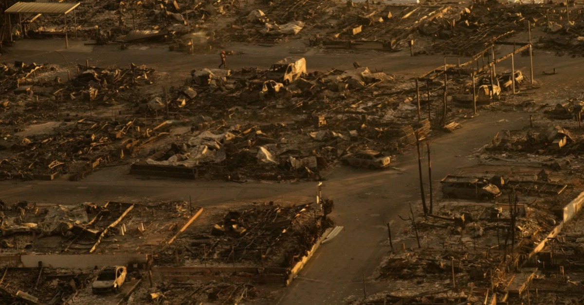 曾是晴天無雲白色建築,增添休閒度假氣氛的,加州太平洋斷崖如今卻只剩下焦黑殘破不堪的建築,窗戶外牆全不見,只剩下建築結構,顯得一片死寂。另一邊從原本的陽光普照、草木叢生,到如今的枯死,建築物更是無法看見一點原貌。