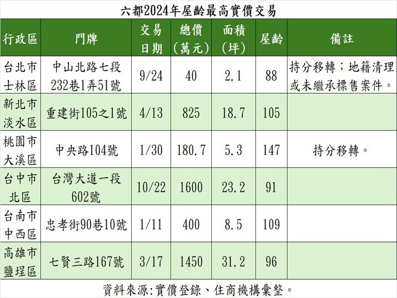 根據實價,台北市去年9月位於天母古道旁一處老宅,總價40萬元出售部分持分,並被備註為地籍清理或無人繼承的標售案件,由於該戶屋齡高達88年,位居北市去年屋齡最高之交易;至於桃園市屋齡最高交易,為大溪老街商圈一處透天店面,該戶部分持分去年1月以總價180.7萬元成交,屋齡高達147年,為去年六大都會區所有交易中,屋齡最高者。