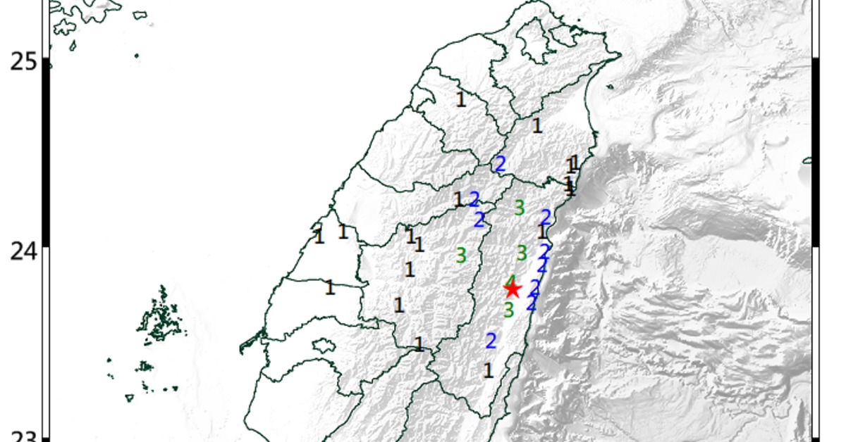 各地最大震度,南投縣3級、臺中市2級、宜蘭縣2級、彰化縣1級、雲林縣1級、新竹縣1級。