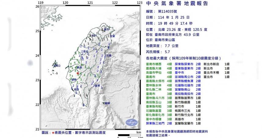 台南昨(25)日晚間7時49分出現規模5.7地震。(圖/中央氣象署官網)
