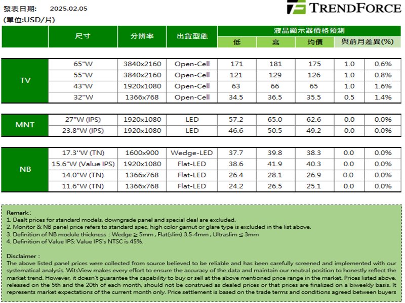 TrendForce研究副總范博毓表示,二月上旬面板價格預估,電視面板部分,32吋預估上漲0.5美元,43吋上漲1美元,50吋持平,55吋與65吋上漲1美元,75吋上漲3美元;顯示器部分,Open Cell面板有空間率先反映微幅上漲0~0.1美元,面板模組則仍維持全面持平態勢;NB面板價格走勢,仍是維持全面持平的態勢。
