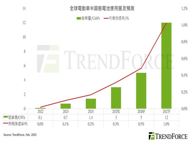 TrendForce:半固態電池裝車量緩步上升 預估2027年滲透率突破1%