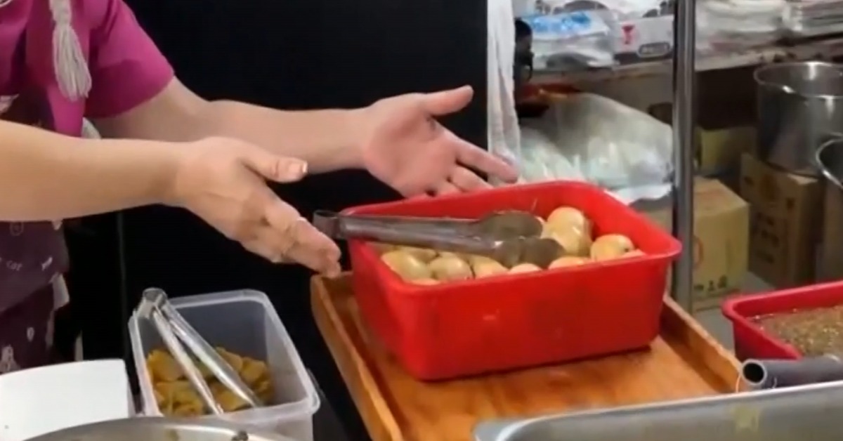 市場麵攤裡,一名員工拿個紅色盆子打撈熱湯,只見她裝了一大勺油豆腐,下一秒又將熱湯全部倒回鍋裡,就這樣重複動作,讓民眾邊吃邊拍下畫面,看起來似乎不太恰當。