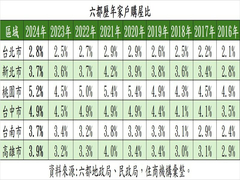 綜觀六都家戶購屋比,六大都會區2024年家戶購屋比以桃園市達5.2%最高, 之後依次為台中市4.9%、高雄市3.9%名列亞軍與季軍,而台北市則以2.8%敬陪末座。大家房屋企劃研究室公關主任賴志昶分析,桃園市房價相較雙北親民,且機場捷運議題,讓沿線各站創造通勤購屋量,加上近年來產業園區帶動人口紅利,在地換屋、首購需求不斷,致使去年家戶購屋比仍處高檔。