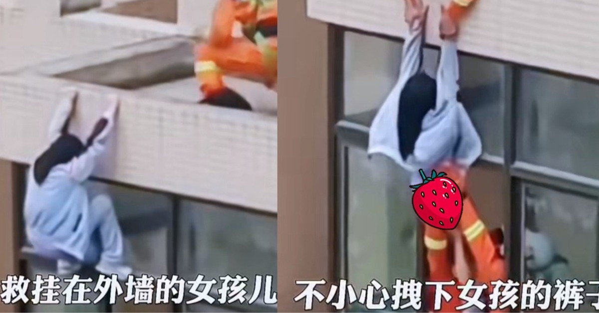 根據陸媒《搜狐網》報導,一名女孩因失戀情緒低落,萌生輕生念頭,跑到高樓屋頂準備與世界告別。當消防員趕到現場展開救援時,女孩情緒仍不穩,不願配合,結果失足從樓頂墜下。第一名消防員迅速抓住女孩的雙手,暫時挽救了她的性命,另一名消防員隨後跑到頂樓陽台,試圖從下方接住她,但由於女孩穿著的運動褲沒有腰帶,褲子不慎被脫了下來。