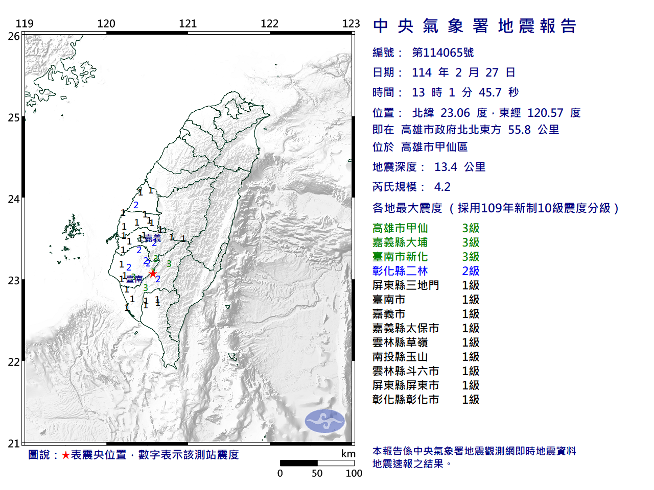 根據中央氣象署詳細地震報告,今日13時01分發生有感地震,震央位於北緯 23.06度,東經 120.57度,即在高雄市政府北北東方 55.8 公里 ,位於高雄市甲仙區,震源深度13.4公里,芮氏規模4.2。