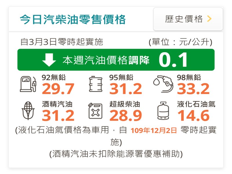 台灣中油公司表示,自明(3)日凌晨零時起汽、柴油價格各調降0.1元,參考零售價格分別為92無鉛汽油每公升29.7元、95無鉛汽油每公升31.2元、98無鉛汽油每公升33.2元、超級柴油每公升28.9元。本週因平穩雙機制啟動,汽、柴油各吸收0.8元及0.4元。
