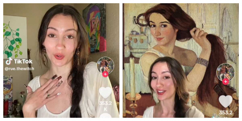 美國22歲網紅日前分享,她的外貌與一幅100多年前的畫作女主角相似,甚至就連髮型、睡衣款式也幾乎一模一樣。(圖/翻攝自TikTok)