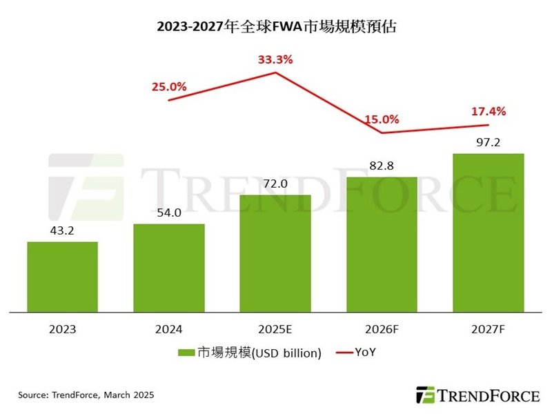 TrendForce:美國、印度電信商加速部署FWA 估2025年全球市場規模達720億美元。(TrendForce提供)