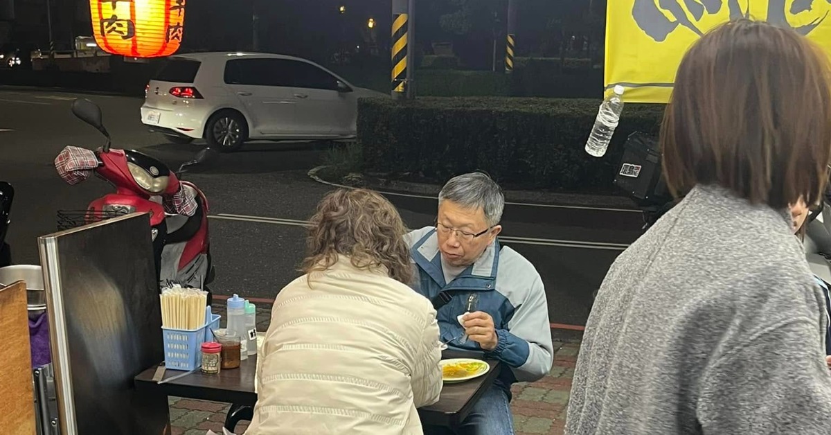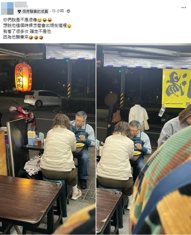 有民眾16日晚間在臉書社團《爆廢公社》PO出兩張照片,只見照片中男子坐在店內用餐,對面還坐著一名捲髮婦人,而男子戴著方形金屬框眼鏡,頭髮有些花白,肉眼看起來和柯文哲非常相似,讓民眾忍不住直呼超級像,想說這個時間怎麼會出現在外面,看了很多次確定不是柯文哲本人,「因為他騎車來」。