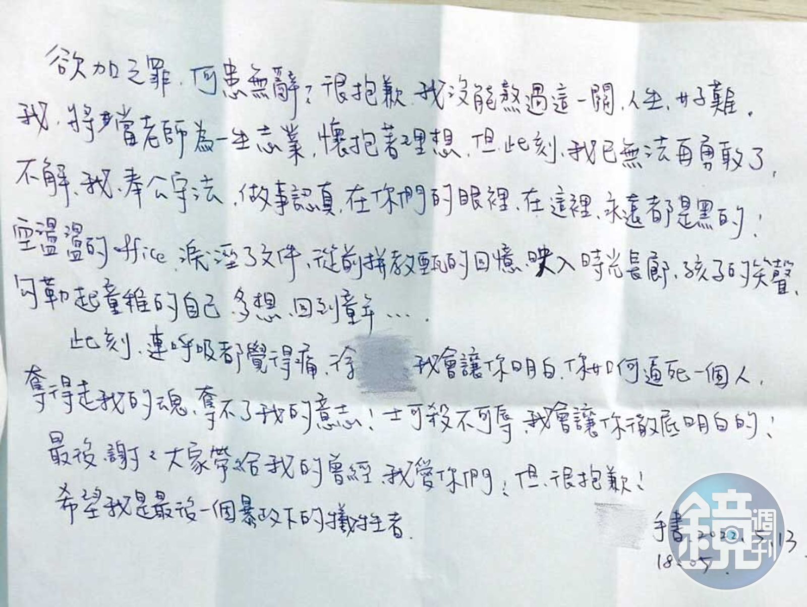 B老師寫下字字血淚的遺書,控訴校長職場霸凌。